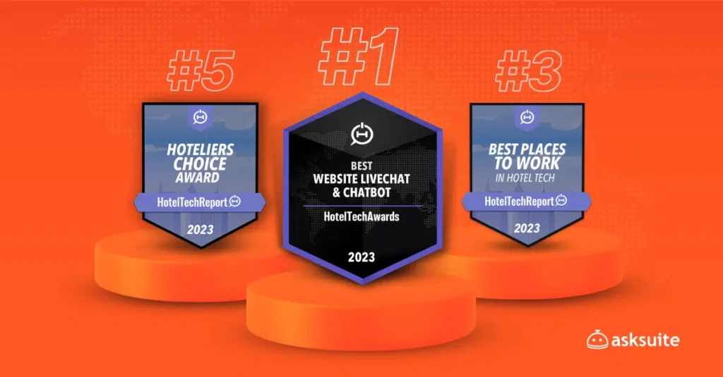 Reviews from hundreds of hoteliers voted Asksuite the best AI Booking Assistant solution in 2020, 2021, 2022 and 2023. The awards are based on customers’ reviews worldwide.